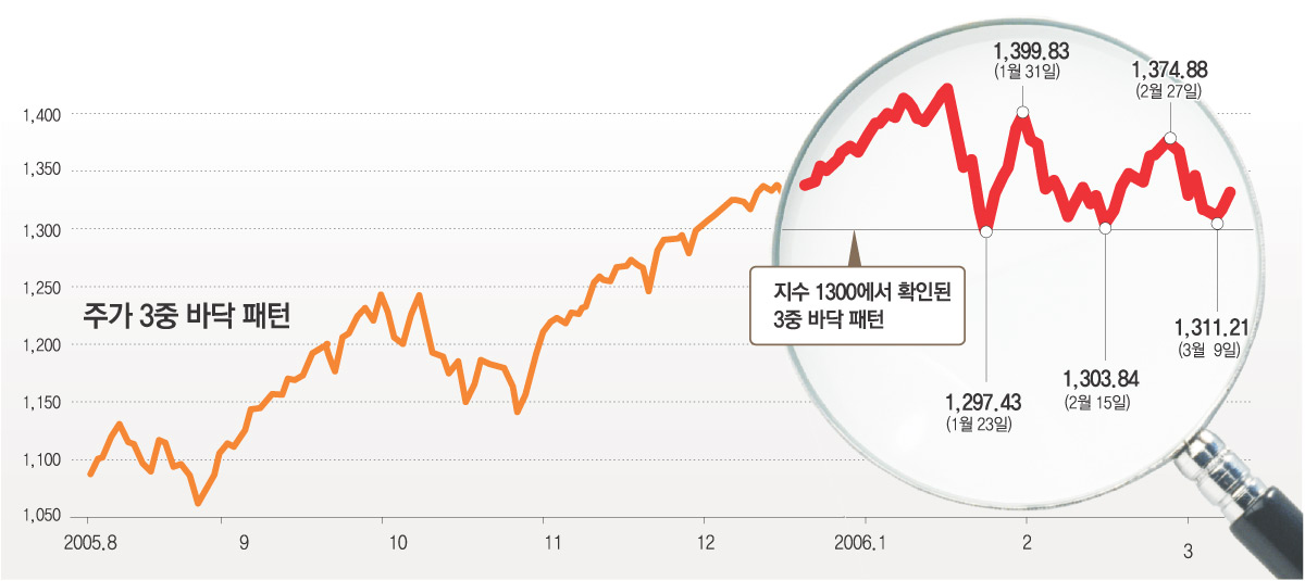 따라서 어지간한 악재가 아니면 주가는 3중 바닥 근처까지 내려와도 다시 반등하는 사례가 대부분이다. 그래서 증권 전문가들은 3중 바닥을 ‘강철 바닥’이라고 부른다.