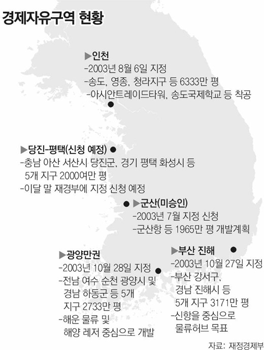 재경부 조성익(趙誠益) 경제자유구역기획단 단장은 13일 “충남도와 경기도가 지난해부터 준비해 온 경제자유구역 지정 신청을 이달 말이나 다음 달 초에 낼 예정”이라며 “전북도는 군산을 경제자유구역으로 지정해 줄 것을 계속 요구하고 있다”고 밝혔다.