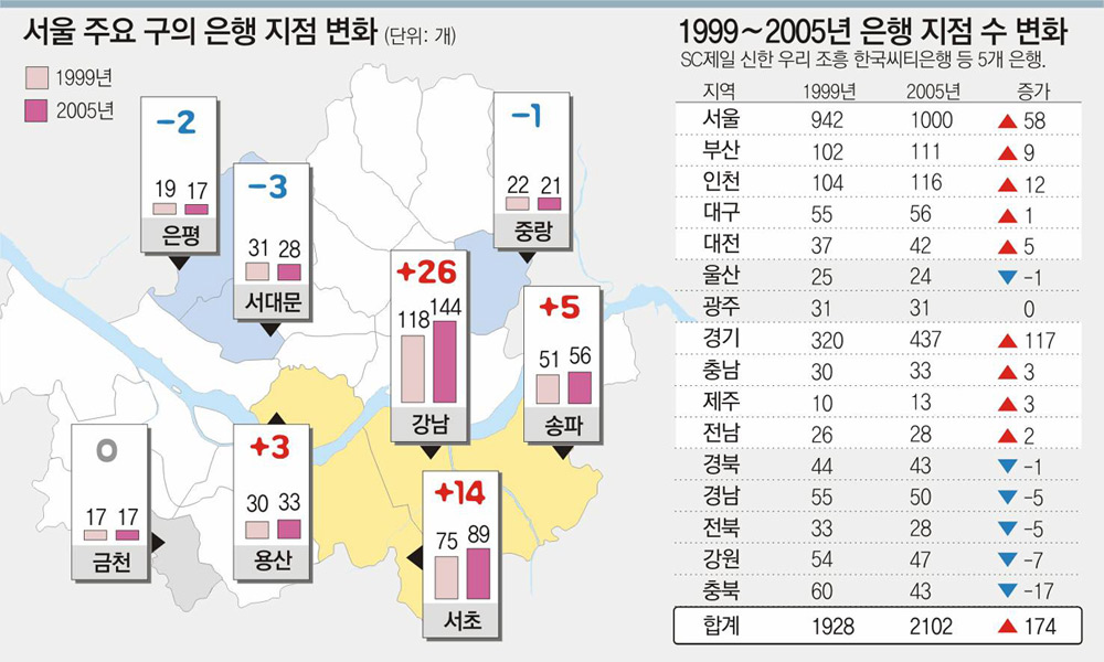 본보가 1999년부터 지난해까지 우리, 신한, 조흥, 한국씨티, SC제일은행의 지역별 지점 현황을 분석한 결과 이들 5개 은행의 지점은 1928개에서 2102개로 총 174개 늘어났다. 하지만 수도권과 광역시를 제외한 일반 도(道) 지역에선 오히려 27개 줄었다.