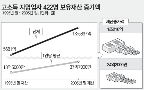422명이 보유한 재산은 1995년 말 총 5681억 원에서 지난해 말 1조5897억 원으로 늘었다. 부동산 값 상승에 따른 자연스러운 재산 증가도 있었지만 세금을 내지 않아 늘어난 재산이 적지 않다고 국세청은 밝혔다. 1인당 평균 재산 증가액은 24억2000만 원.