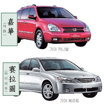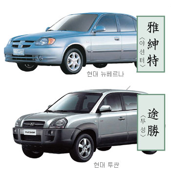 현대차는 스포츠유틸리티차량(SUV) 투싼을 중국에서 투성(途勝)으로 팔고 있다. 원래 발음과 유사한데다 ‘도로의 승리자’라는 뜻도 있어 중국 소비자의 마음을 움직이고 있다. 이전에 단순히 발음만을 고려해 엘란트라(아반떼의 수출명)와 쏘나타를 각각 ‘이란터(伊藍特)’와 ‘쒀나타(索納塔)’로 명명했던 것보다 현지 반응이 좋단다.