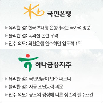 반면 하나금융지주는 박 국장의 독과점 발언이 ‘월권 행위’라며 반발했다. 하나금융지주 김승유 회장과 윤교중 사장은 20일 윤증현 금감위원장을 면담하는 등 외환은행 인수에 총력을 기울이고 있다.