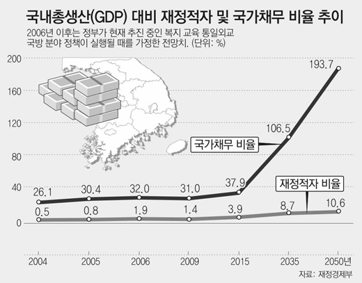 유럽연합(EU)은 GDP 대비 국가채무비율이 60% 이하면 건전한 재정으로, 60% 초과면 불안한 재정으로 본다. 한국은 아직 이 수준보다 많이 낮지만 복지 지출이 늘면서 채무 부담이 커질 것으로 재경부는 우려하고 있다.