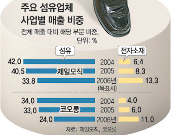 제일모직은 휴대전화, 모니터 외장재 중심의 화학사업 분야와 반도체 LCD 부품 등 전자소재 분야의 매출 비중이 2004년 57.9%로 처음 절반을 넘었다. 올해에는 비중이 더 높아질 전망이다.