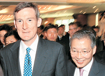 강정원 국민은행장(오른쪽)과 엘리스 쇼트 론스타 부회장이 23일 서울 영등포구 여의도 63빌딩에서 열린 외환은행 매각 관련 기자회견을 마치고 밝은 표정으로 회견장을 빠져나가고 있다. 홍진환 기자