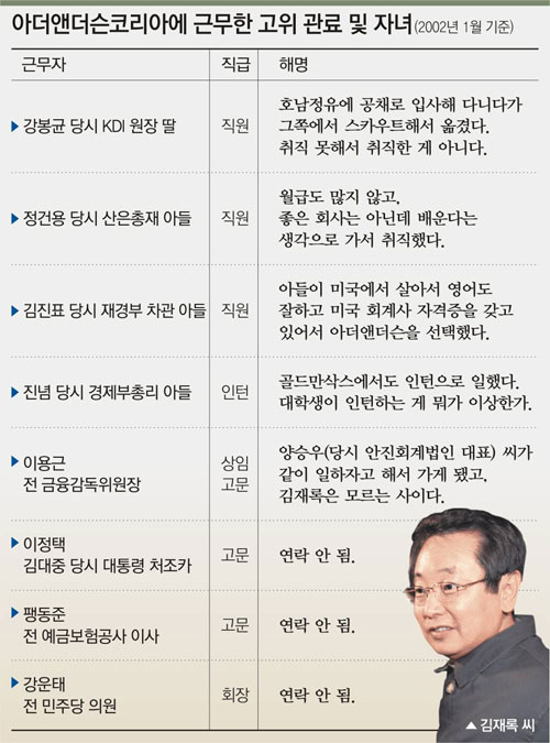 그가 아더앤더슨코리아에 근무할 때 경제부총리 출신인 진념(陳稔) 씨와 김진표(金振杓) 현 부총리 겸 교육인적자원부 장관, 재경부 장관 출신인 강봉균(康奉均) 현 열린우리당 정책위 의장, 정건용(鄭健溶) 전 산업은행 총재의 자녀가 이 회사에 직원이나 인턴으로 들어갔다. DJ의 처조카인 이정택 씨와 팽동준(彭東俊) 전 예금보험공사 이사는 고문으로, 강운태(姜雲太) 전 의원은 회장으로 영입되기도 했다.