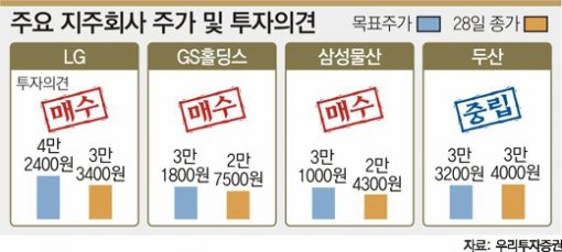 우리투자증권 이훈 연구원은 “지주회사는 깨끗한 지배구조와 풍부한 배당 등으로 주주가치를 높여 왔지만 주가가 이를 반영하지 못해 저평가된 경우가 많다”며 “순수 지주회사 가운데는 LG, 지주회사 역할을 하는 회사 가운데는 삼성물산의 주가 전망이 밝다”고 말했다.