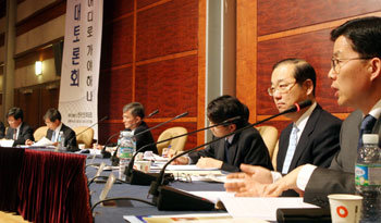 《보수와 진보가 만났다. 29일 서울 강남구 삼성동 코엑스에서 한국선진화포럼 주최로 열린 ‘한국 사회 어디로 가야 하나’라는 주제의 토론회에서 보수와 진보 진영으로 분류되는 학자들이 한국 사회의 과거와 현재, 미래에 대해 열띤 토론을 벌였다. 주제발표는 보수 진영에선 뉴라이트 계열로 분류되는 ‘교과서포럼’의 박효종(朴孝鍾·정치학) 전상인(全相仁·사회학) 서울대 교수가 맡았다. 진보 진영에선 ‘지속 가능한 진보’를 내세우는 ‘좋은정책포럼’의 임혁백(任爀伯·정치학) 고려대 교수와 김형기(金炯基·경제학) 경북대 교수가 주제발표를 맡았다. 이날 행사는 성장과 분배, 큰 정부와 작은 정부, 양극화 문제 등을 놓고 우리 사회 보수와 진보 진영 간의 이념 갈등이 위험 수위에 이르렀다는 평가가 나오는 가운데 양측의 대표 논객들이 한자리에 모여 토론을 벌였다는 점에서 눈길을 끌었다.》