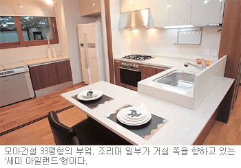 4베이로 설계된 33A평형은 안방 옆의 일자형 수납공간이 인상적이고, 부엌 중 일부가 거실을 향하는 ‘세미 아일랜드’ 설계가 도입됐다.
