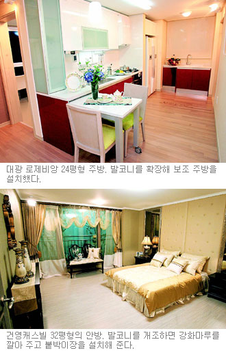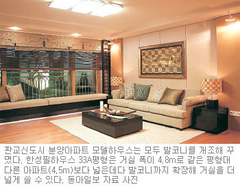 발코니 개조로 실제 주거 면적이 7∼10평 정도가 늘어나 30평형대 모델하우스가 40평형대처럼 보인다. 하지만 이렇게 고치려면 1500만 원 안팎의 비용을 더 내야 한다. 발코니가 확장된 형태로 설계되다 보니 발코니를 트지 않으면 공간 활용도가 떨어지는 편이다.
