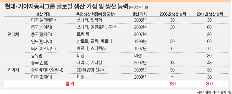 현재 현대·기아차그룹의 해외 생산 능력은 연간 139만 대. 이를 앞으로 5년 뒤인 2011년까지 309만 대 수준으로 2배 이상 늘리겠다는 것이 이 그룹의 계획이다.