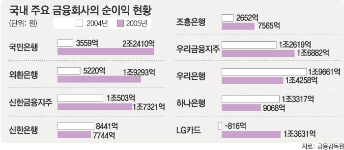 ‘리딩 뱅크’인 국민은행의 순이익도 크게 늘었다. 국민은행은 지난해 순익 2조 2410억 원으로 ‘순익 2조 원 클럽’에 이름을 올렸다. 2004년 순이익이 4000억 원도 안 됐다는 것이 믿기지 않을 정도다. 은행권에서 순이익이 2조 원을 넘은 것은 국민은행이 처음이다.