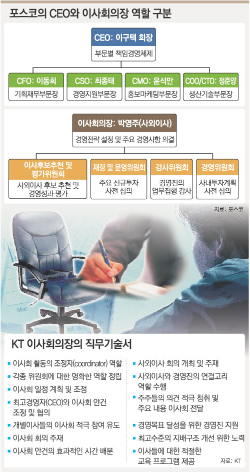 국내 기업 가운데 처음 CEO와 이사회의장을 분리한 KT 이사회는 사외이사(8명)가 전체 이사회 멤버(11명)의 73%를 차지한다. 두 회사 모두 사외이사 중에서 임기 1년의 이사회의장을 뽑고 사외이사가 돌아가며 의장 직을 맡는다.