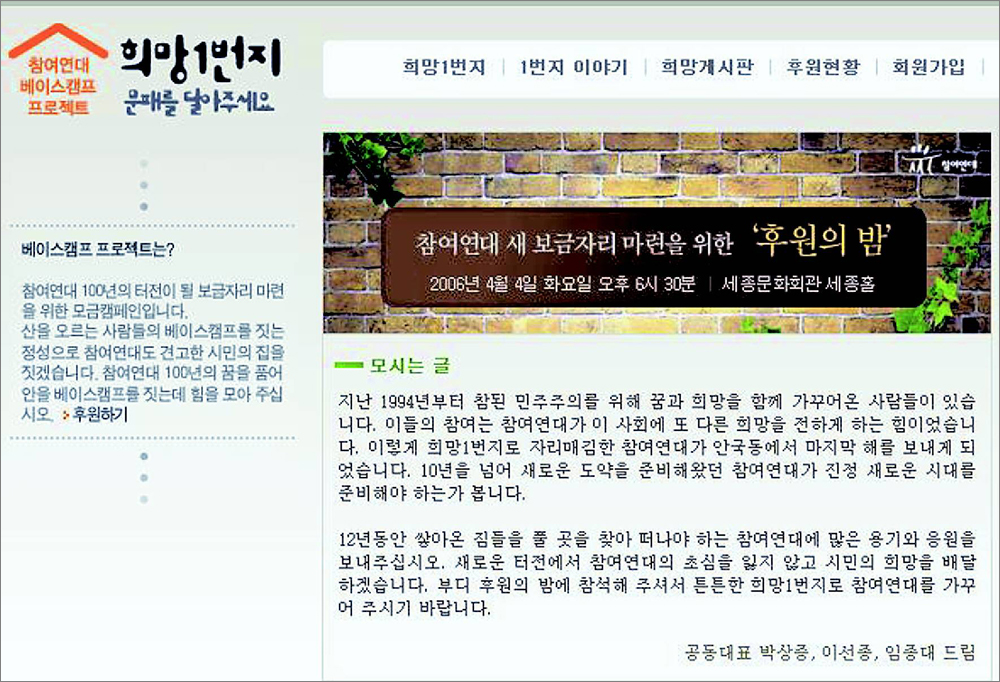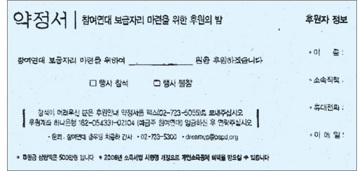 참여연대는 4일 저녁 서울 종로구 세종문화회관에서 ‘참여연대 보금자리 마련을 위한 후원의 밤’ 행사를 열기로 하고 최근 850개 상장기업과 개인 3500명에게 후원 약정서가 담긴 초청장을 보낸 것으로 3일 밝혀졌다.