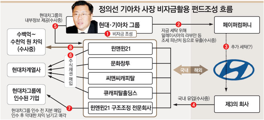 검찰에 따르면 현대차그룹은 글로비스 등 계열사를 통해 수백억 원의 비자금을 조성한 뒤 이를 동남아 지역 조세 피난처의 페이퍼 컴퍼니(서류상 회사)를 통해 세탁한 것으로 알려졌다.