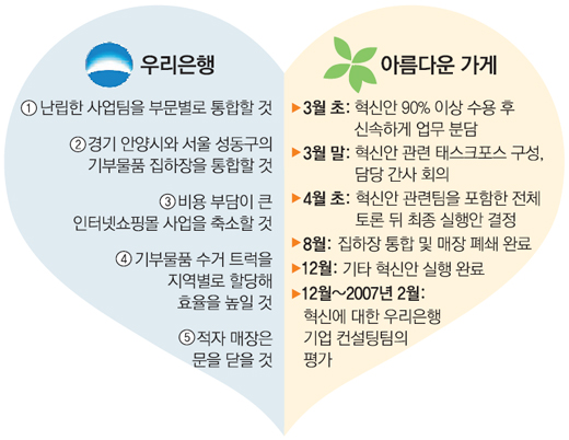 아름다운 가게의 운영진이 ‘우리는 어떻게 해야 하나’라며 고민에 빠졌을 무렵 반가운 제안이 들어왔다. 우리은행 기업 컨설팅팀이 무료로 컨설팅을 해 주겠다고 나선 것.
