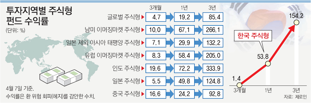 펀드평가회사 제로인에 따르면 지난해 말 4조3429억 원이었던 해외 펀드 수탁액은 11일 7조1770억 원으로 3개월 만에 3조 원 가까이 늘었다.