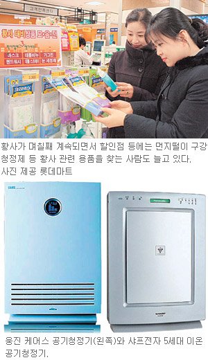 황사철을 맞아 공기청정기를 찾는 소비자가 많다. 각 유통업체는 다양한 할인행사를 진행한다. 롯데마트는 4월 한 달 동안 이월상품은 10∼40%, 신상품은 10% 할인한다. 이월상품 한일공기청정기는 16만8000원(정상가 대비 40% 할인), 신상품 샤프공기청정기는 36만9000원(정상가 41만 원), LG공기청정기는 44만9100원(정상가 49만9000원) 등.
