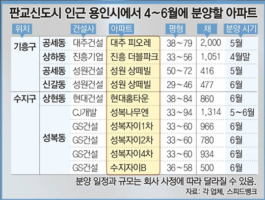 우선 상현동 신봉동에서 현대건설 GS건설 CJ개발 등이 5000채 이상을 5, 6월에 분양할 계획이다.
