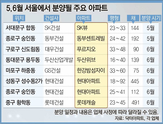 두산산업개발은 역시 청계천에서 멀지 않은 동대문구 용두동 일대에 짓는 두산위브 아파트 433채 중 16∼40평형 139채를 내놓는다.
