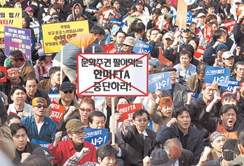 ▽한미 FTA는 제2 을사늑약=지난달 28일 출범한 ‘한미 FTA 저지 범국민운동본부’는 15일 서울 종로구 대학로에서 노동자와 농민 등 8000여 명이 참여한 가운데 제1차 범국민대회를 열었다. 이들은 “한미 FTA가 국민의 생존권을 위협하고 한국을 미국에 종속시키는 결과를 낳을 것”이라고 비판했다.