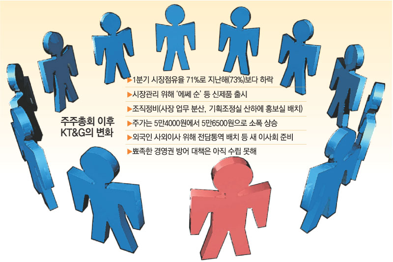 국내 담배를 독점생산하고 있는 KT&G는 아이칸 측의 공략을 받는 사이 1분기(1∼3월) 시장점유율이 지난해 73%에서 올해는 71%로 2%포인트가량 떨어졌다. 경영권 방어에 신경 쓰는 동안 외국 담배회사들이 치고 올라온 것이다.
