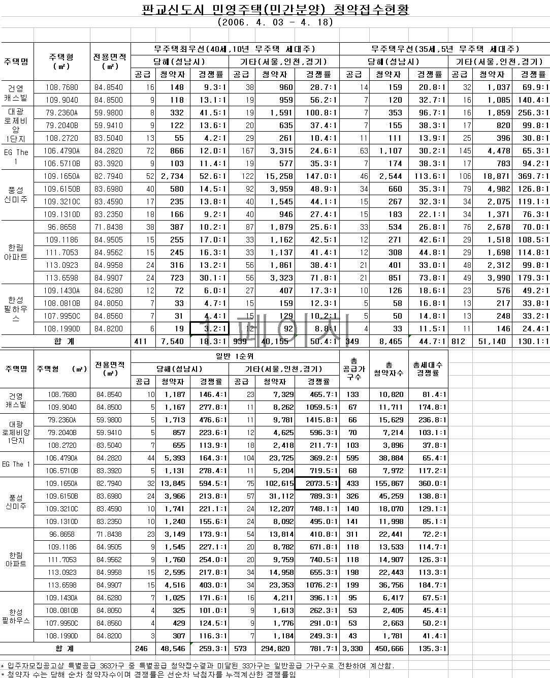 18일 판교 신도시 민간분양 및 임대 청약 일정이 모두 끝남에 따라 건설교통부는 19일 판교 민간 분양 아파트 평형별 경쟁률을 발표했다.