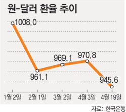 이날 서울외환시장에서 원-달러 환율은 전날보다 8원 떨어진 945.6원으로 거래를 마쳤다. 1997년 10월 27일(939.9원) 이후 8년 6개월 만에 가장 낮은 환율이다. 원-달러 환율은 지난해 연간 3.0% 하락했으나 올해 들어 벌써 7.0%나 떨어졌다.