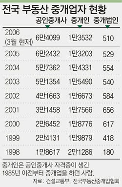 3월 현재 전국 중개업자 수는 7만8141명으로 외환위기 직후인 1998년 4만83명의 두 배에 가깝다. 올해 말에는 8만 명으로 늘어나리라는 게 업계의 전망이다.