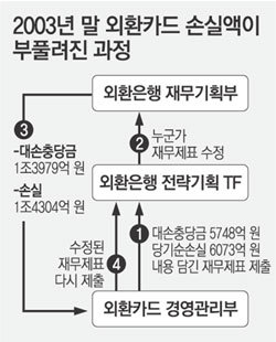 하지만 감사원의 생각은 다르다. 외환은행이 2003년 말 외환카드에 대손충당금을 8000억 원 이상 더 쌓으라고 지시한 대목이 석연치 않기 때문이다. 대손충당금은 빌려준 돈 가운데 회수가 불가능할 것에 대비해 미리 쌓아 두는 돈이다.