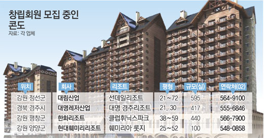 CIT건설과 대림산업은 강원 정선군 강원랜드 인근에서 ‘선데일리조트’ 창립 회원을 모집하고 있으며 한화리조트는 강원 평창군 보광휘닉스파크 내에 있는 콘도 ‘클럽휘닉스파크’를 선보였다. 현대훼미리리조트는 강원 양양군 서면의 오색국민관광단지, 대명제러산업은 경북 경주시 보문단지 내에 있는 콘도를 분양하고 있다.