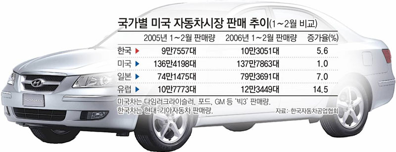 올해 1, 2월 미국 시장에서 한국 차의 판매량은 지난해 같은 기간에 비해 5.6% 늘었으나 일본 차와 유럽 차의 판매량은 각각 7%와 14.5% 증가했다.