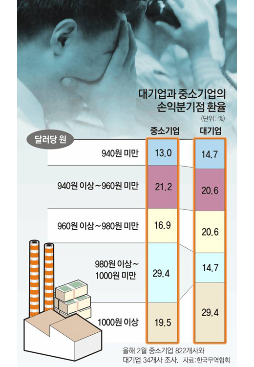 한국무역협회가 2월 대기업 34개, 중소기업 822개 등 856개 수출기업을 조사한 결과에 따르면 평균 손익분기점 환율은 중소기업 983.3원, 대기업 973.2원이었다. 환율이 이보다 밑으로 떨어지면 수출을 하고도 적자를 본다는 의미다.