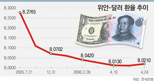 위안화의 평가절상 가능성은 달러에 대한 원화 강세(원-달러 환율 하락)에 가속도를 붙여 가뜩이나 고유가로 전망이 불투명한 올해 한국 경제에 또 다른 암초로 작용할 전망이다.