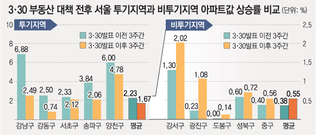 부동산정보업체인 스피드뱅크에 따르면 강남 서초 송파구 등 서울시내 14개 투기지역 아파트값은 3·30대책 발표 전 3주 동안(3월 12∼29일) 2.23% 올랐으나, 대책 후 3주 동안(4월 2∼22일)은 1.67% 오르는 데 그쳤다.