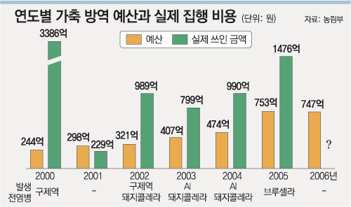 2000년 이후 정부는 당초 책정된 가축 방역 예산보다 연평균 3배를 더 쓴 것으로 나타났다. ▶그래픽 참조