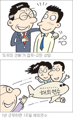 ㈜태평양은 2005년 멘터링 제도를 도입했다. 선배 한 명이 신입사원 한 명을 맡아 3개월 동안 업무에서 인생고민까지 상담하며 후배의 일처리 능력과 소속감을 키우는 것이다. 서로 어울려 여가를 즐기며 유대감을 키우는 데 드는 비용을 회사가 전액 지원한다.