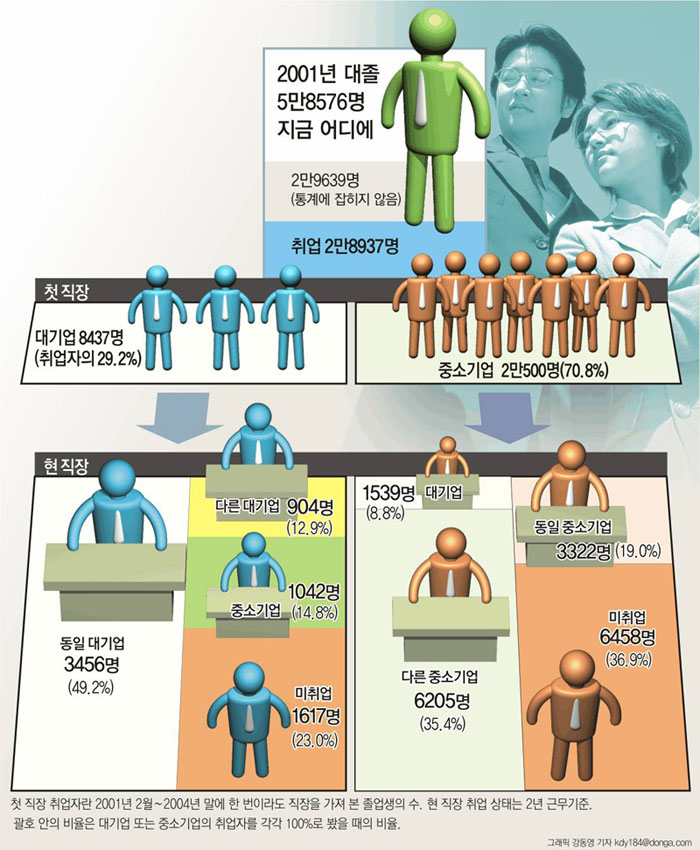 이들 가운데 대기업에 취업한 사람은 8437명, 중소기업 취업자는 2만500명이다. 나머지 2만9639명은 고용보험에 가입하지 못한 영세기업이나 자영업, 미취업 상태로 통계에 잡히지 않는다.