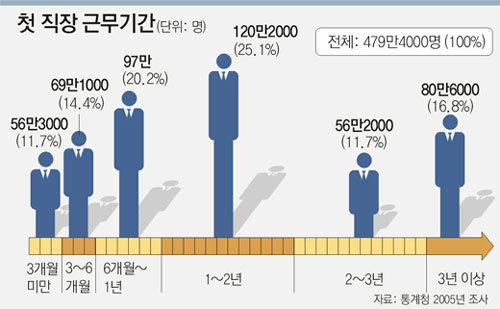 직장 이동이 심화되는 현상은 최근 통계에서도 드러난다. 통계청의 지난해 조사에서 청년 취업자(15∼29세)의 약 70%가 평균 17개월 만에 첫 직장을 그만두는 것으로 나타났다.