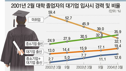 이 조사에 따르면 중소기업(300명 미만)에서 첫 직장을 잡아 2년 이상 근무한 대졸자가 대기업에 입사한 비율은 2004년 3월 현재 35.9%로 졸업 이후 실업자로 지내다 대기업에 입사한 대졸자의 비율(32.1%)보다 높았다.