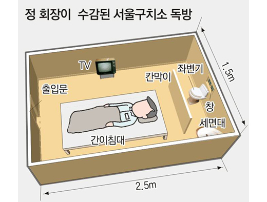 간단한 신체검사와 사진촬영을 끝낸 정 회장은 일반사동 3층의 독방에 입감된 뒤 곧바로 잠자리에 들었다. 서울 용산구 한남동의 대저택에서 지내온 정 회장의 1.07평짜리 좁은 독방 생활은 이렇게 시작됐다.