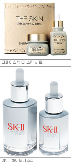 LG생활건강의 ‘오휘 멜라니쉬 화이트 3종 세트’(11만 원)는 서양 자두 추출물과 부채꽃 성분이 노화된 각질 제거에 탁월하다는 설명. 리필도 가능해 실속을 챙길 수 있다.