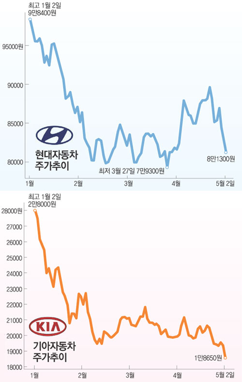 2일 두 회사의 지난달 국내 및 해외 판매가 모두 급감했다는 소식이 알려지면서 주가 하락세는 더욱 뚜렷해졌다. 거래일 기준으로 3일 동안 현대자동차 주가는 6.6%, 기아자동차 주가는 3.6% 떨어졌다.