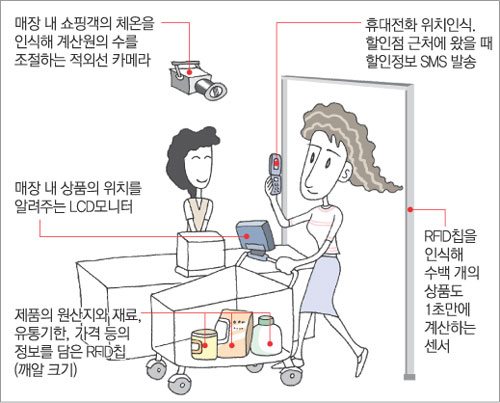 쇼핑을 끝낸 황 씨는 계산대 직원에게 가볍게 인사만 하고 지나친다. 계산대에 설치된 센서가 황 씨의 고객카드와 쇼핑카트에 실린 물품의 전자태그(RFID)를 인식하면서 결제가 자동으로 이뤄졌기 때문이다.