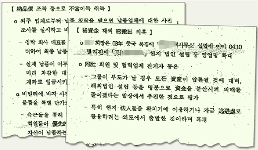 ▽비자금 조성?=국정원 보고서에는 제이유그룹이 협력업체에 줘야 할 물품대금을 몇 개월씩 지연시키거나 외주업체 납품 때 일정 금액을 회사 임원의 차명계좌로 입금시키는 방법으로 비자금을 만들었다고 나와 있다. 이렇게 조성한 비자금이 2000억 원대에 이른다는 것.