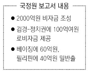 국정원이 작성한 제이유그룹의 ‘비자금 규모 및 은닉 실태’ 보고서에 따르면 제이유그룹은 △회사 고문, 총경리, 이사 등을 통해 2000억 원의 비자금을 조성하고 △검경 및 정치권에 100억여 원을 로비자금으로 사용했으며 △중국 베이징(北京)과 필리핀에 각각 60억 원, 40억 원을 밀반출했다는 것.