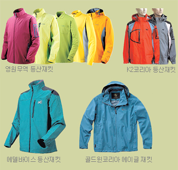 노스페이스, 아이더, 팀버랜드 등 등산용품 브랜드 제품을 10만 원대 초반에 구입할 수 있다. 세탁을 하거나 말리기도 쉽다. 올봄에는 푸른색 계열이 유행하는 편이다.