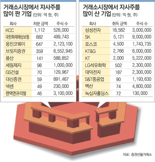 증권선물거래소 관계자는 “연초 주가가 약세를 보인 영향으로 자사주 처분은 줄고 주가 관리를 위해 자사주를 사들인 기업은 늘었다”고 말했다.