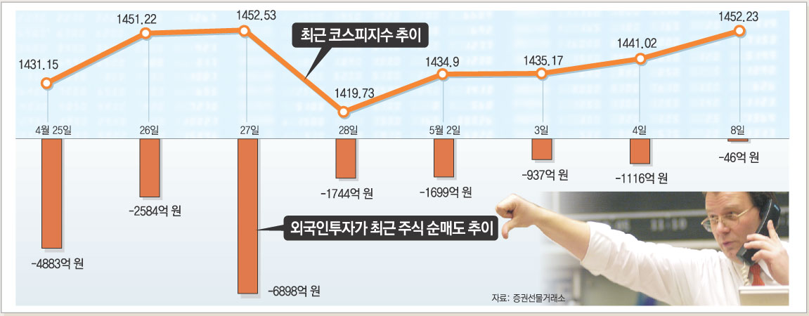 그동안 주가가 꾸준히 오르기는 했지만 영 찜찜했던 것이 바로 외국인의 매도 공세였다. 외국인들은 지난주까지 거래일 기준으로 7일 동안 무려 2조 원어치가량의 주식을 팔아 치웠다.