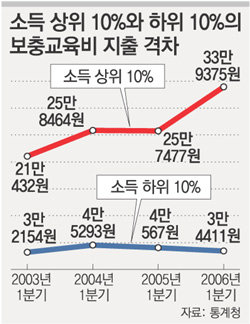 통계청이 내놓은 2006년 1분기(1∼3월) 전국 가구의 가계수지 동향에 따르면 소득 상위 10%에 해당하는 계층의 월평균 보충교육비는 33만9375원으로 하위 10% 계층(3만4411원)의 10배 정도 됐다.